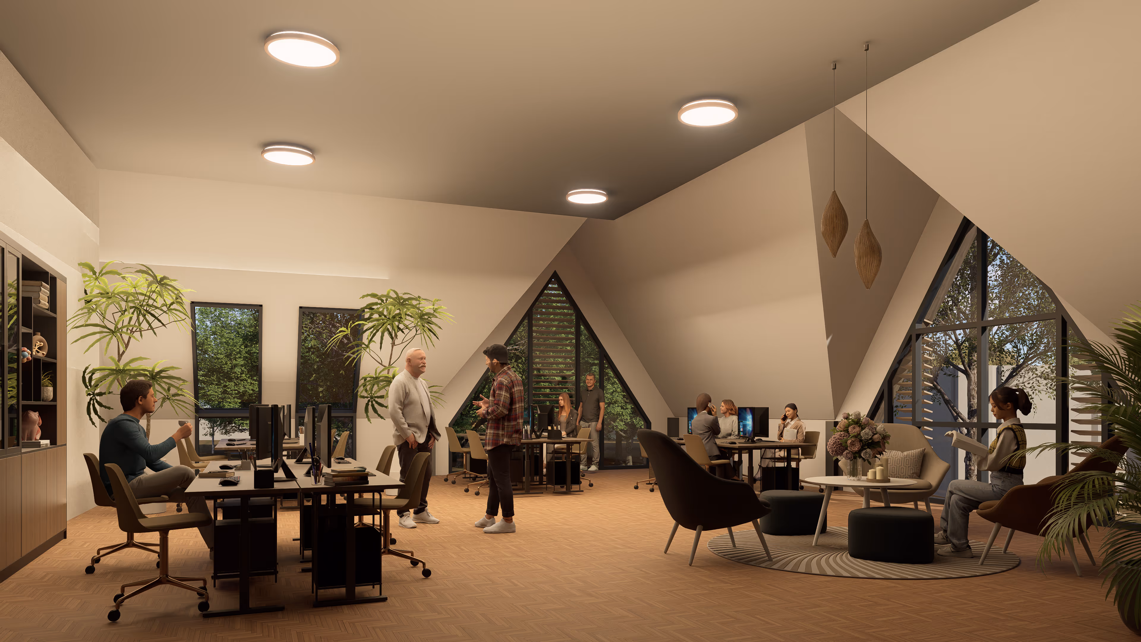 De kantoorlofts zijn omringd door een groene omgeving.